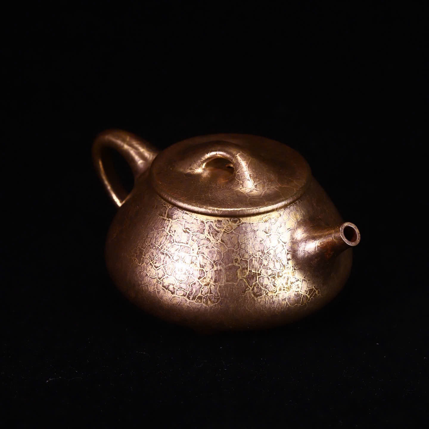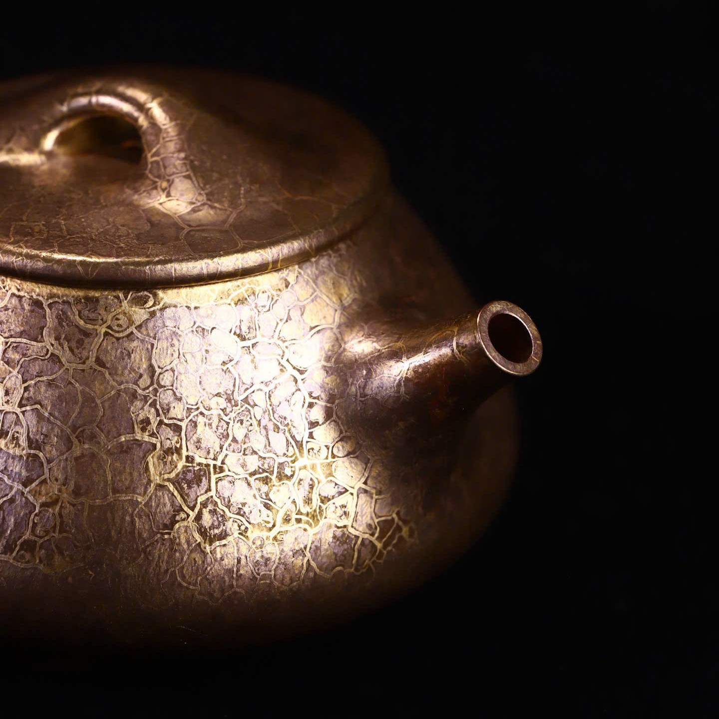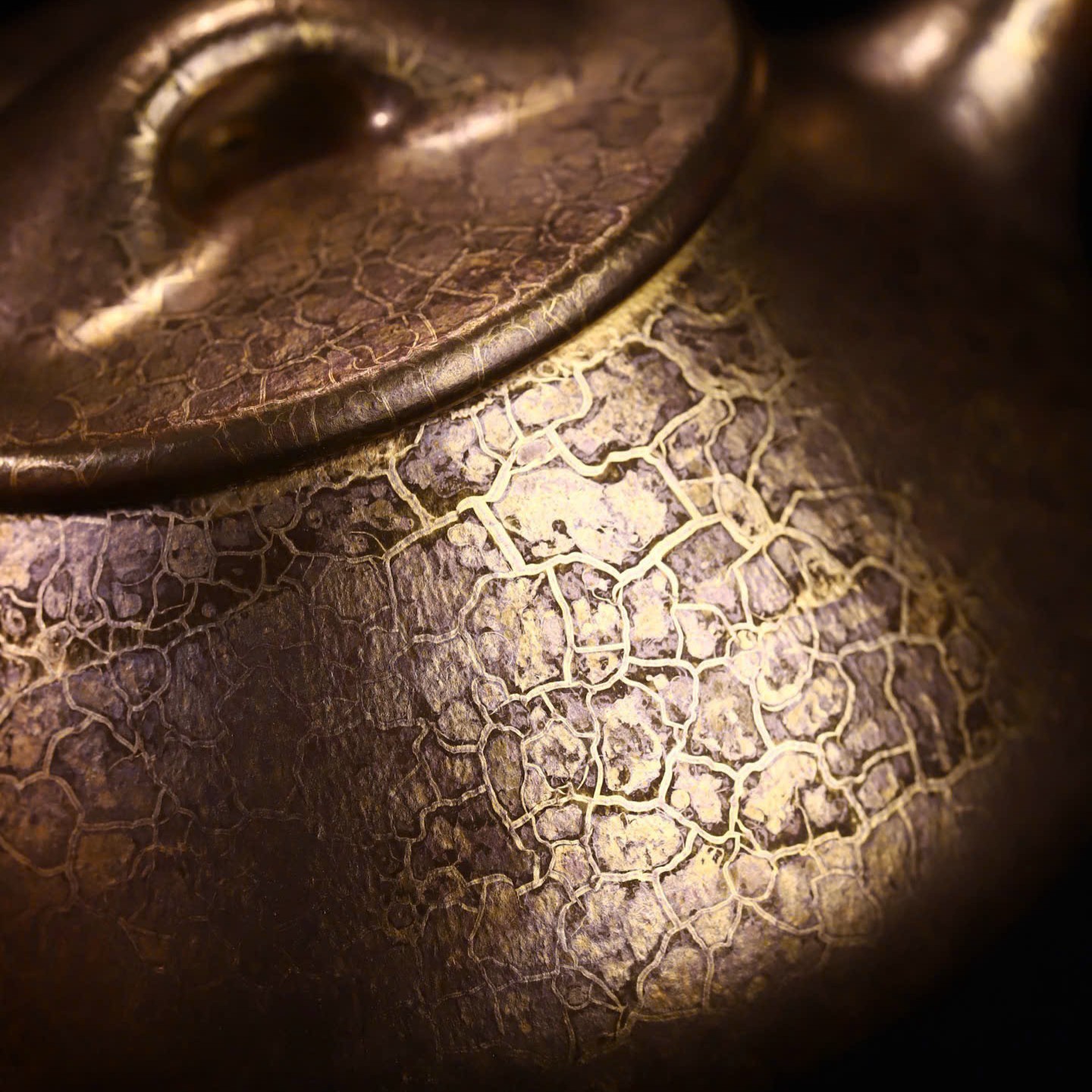 Mỗi chiếc ấm là một độc bản. Lớp “áo men” ánh vàng tự nhiên do canxi từ vỏ sò hóa thân ở nhiệt độ 1200-1300°C tạo ra những vệt rạn không thể sao chép — không có hai chiếc ấm nào giống nhau hoàn toàn.