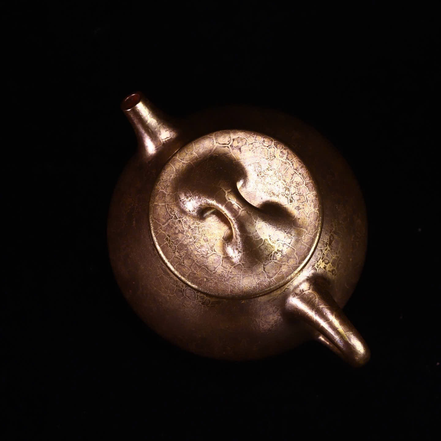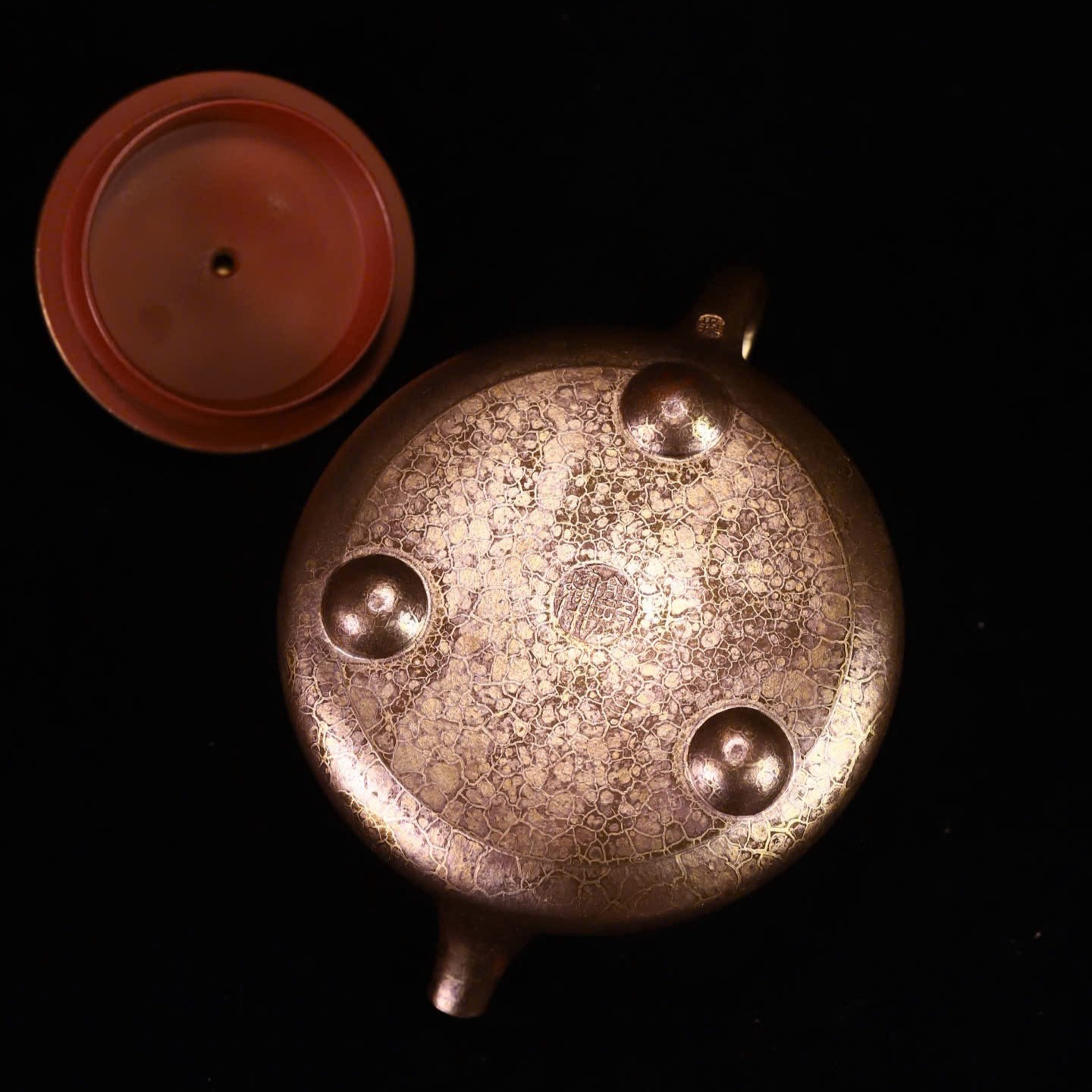 - Ở nhiệt độ này, canxi và các khoáng chất trong vỏ sò bay hơi, hóa thân thành lớp “áo men” ánh vàng kim bám tự nhiên lên thân ấm — trong khi lòng ấm và nội thất nắp vẫn giữ nguyên màu đỏ chu nê gốc.