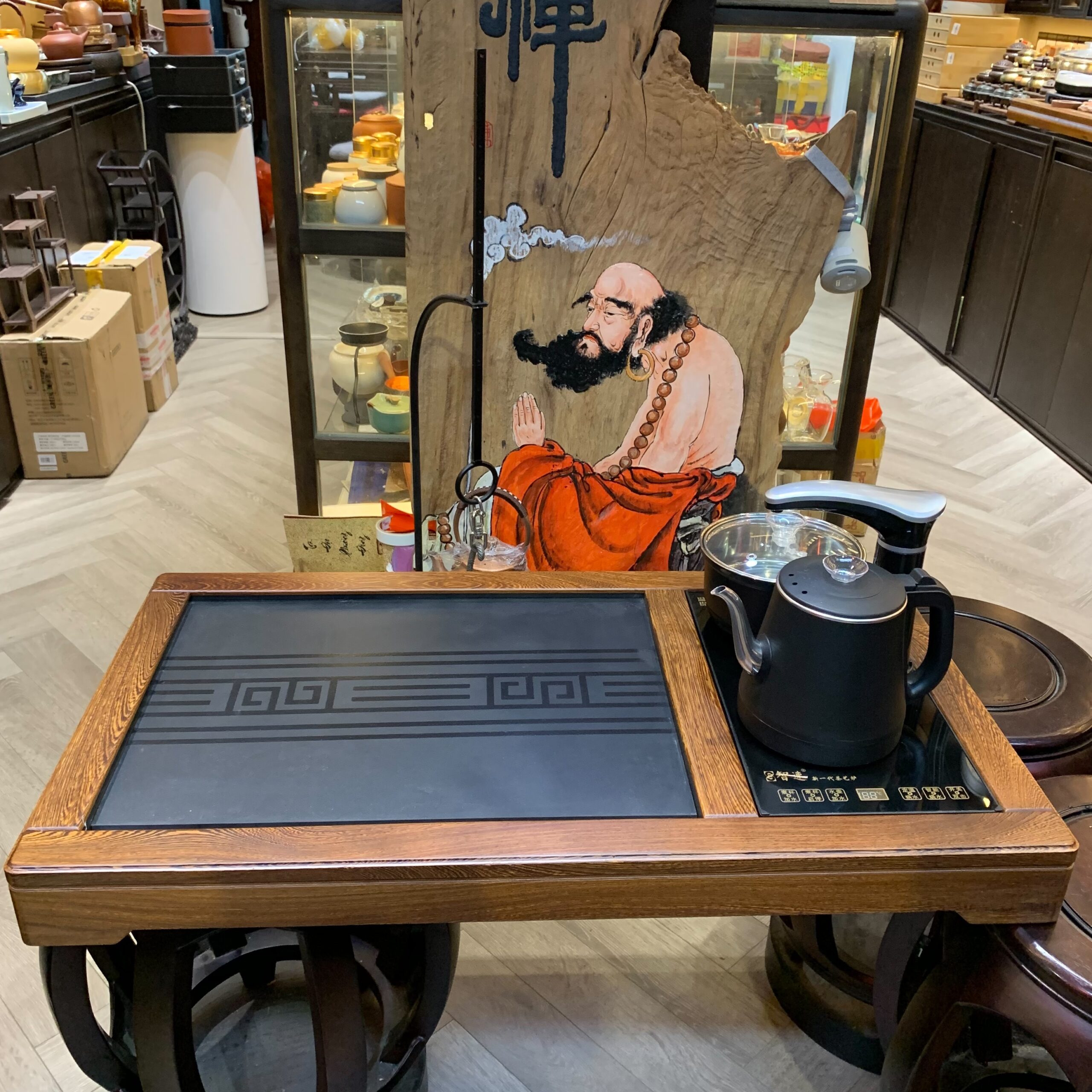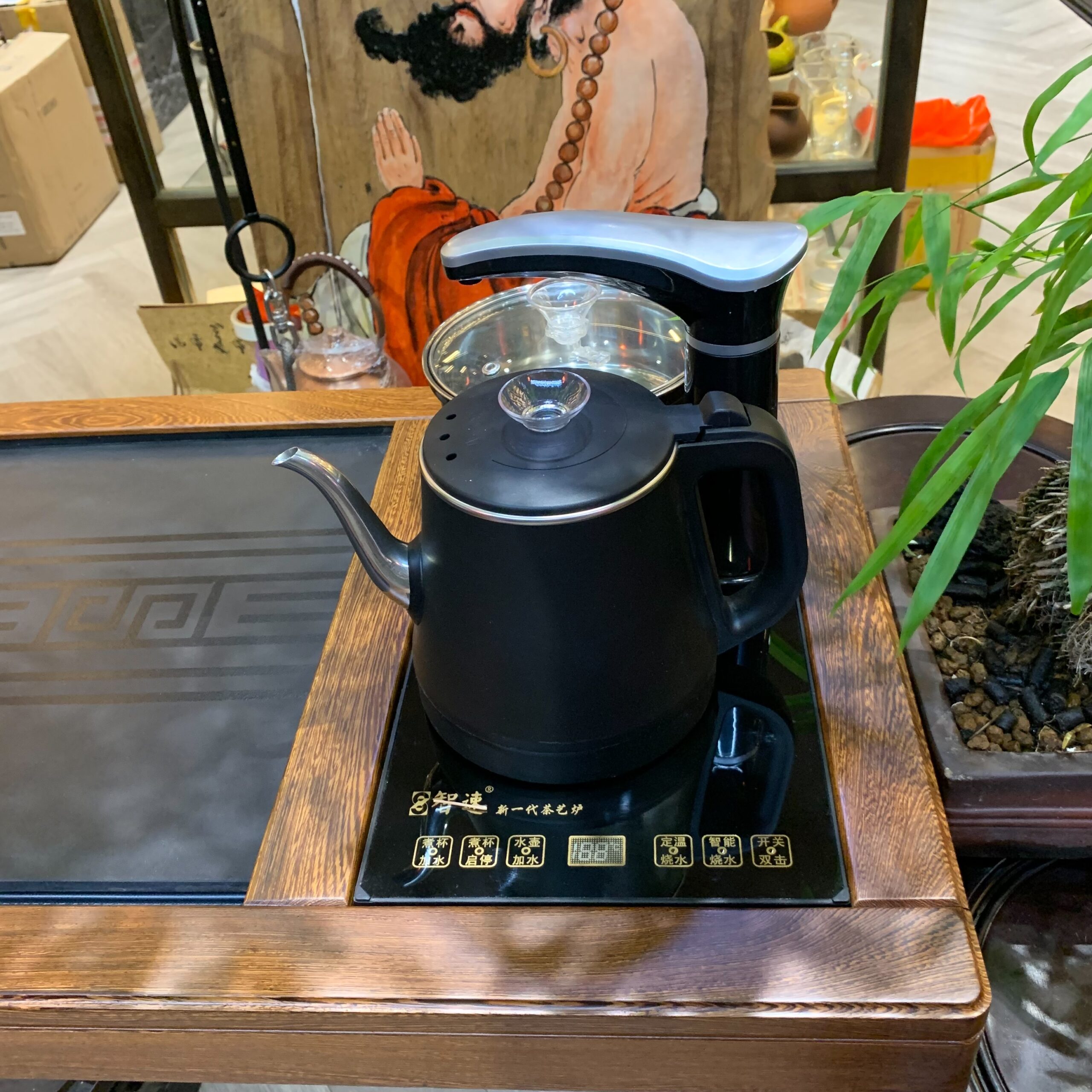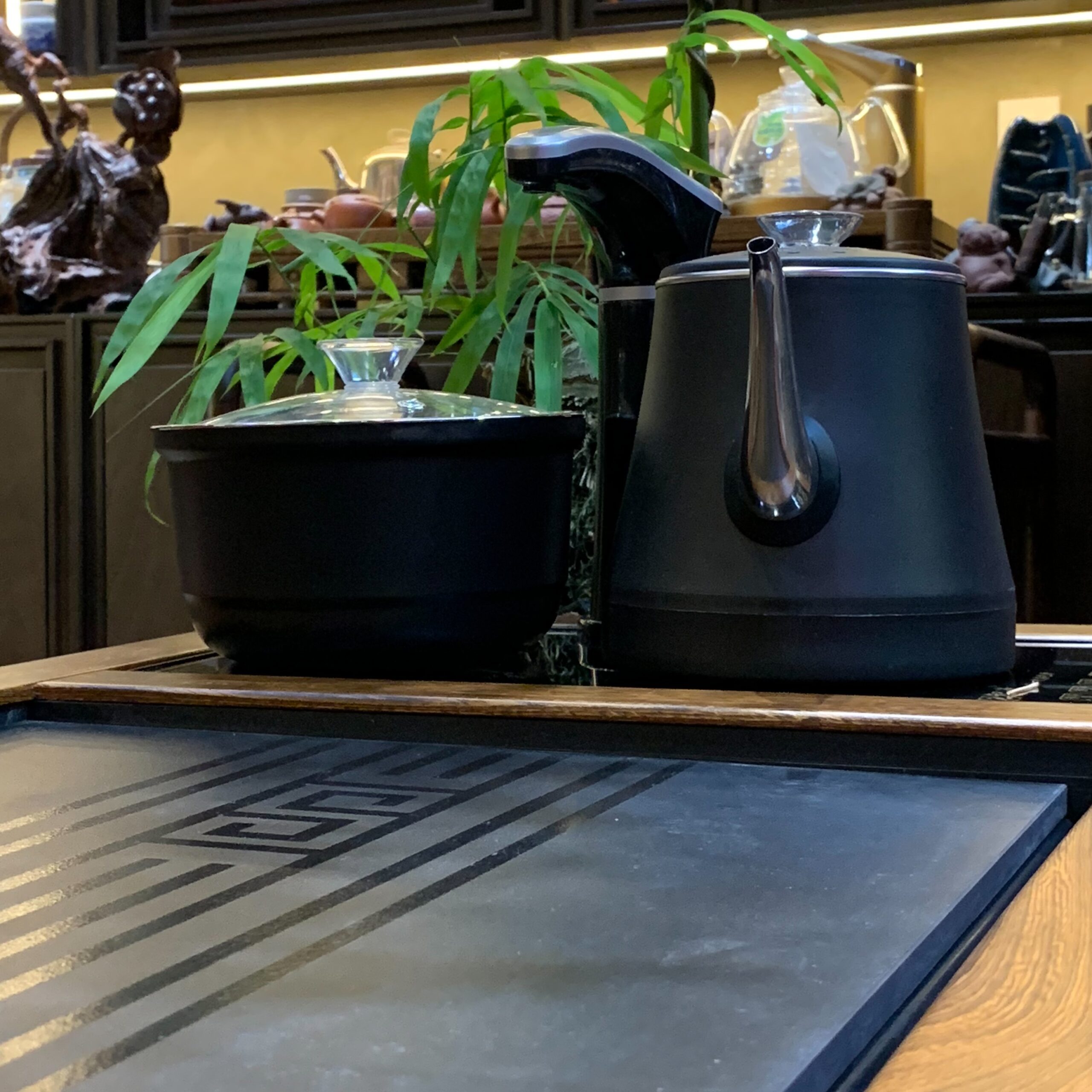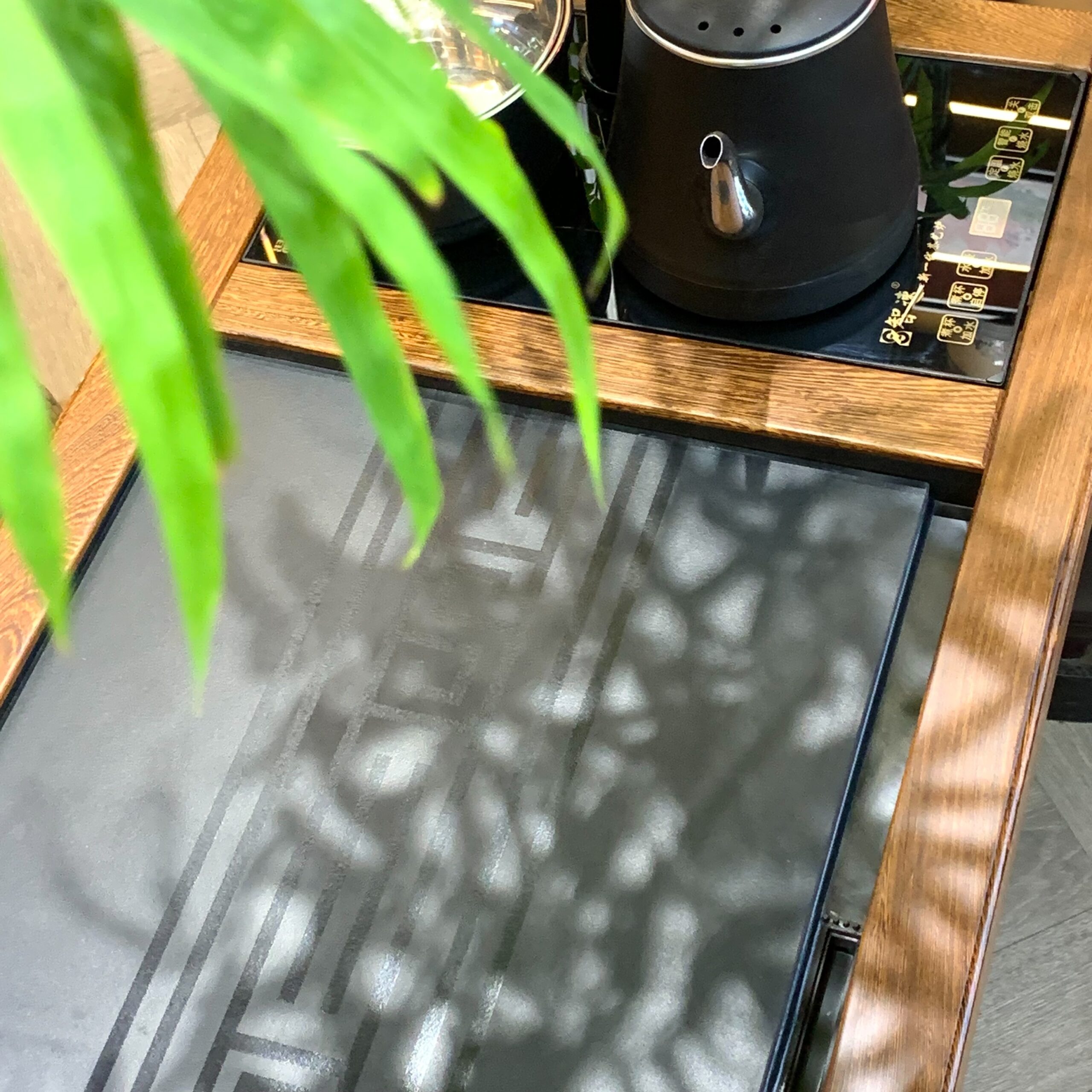 Điểm tạo nên sự khác biệt của dòng bàn trà điện đa năng này nằm ở hệ thống điện được tích hợp tinh vi: bếp đun nước tốc độ cao giúp nước sôi nhanh đều, vòi nước tự động có thể điều chỉnh lưu lượng, và khay thoát nước âm sàn giữ mặt bàn luôn khô ráo. Toàn bộ dây điện được ẩn gọn bên trong khung gỗ — không lộ dây, không mất thẩm mỹ. Mọi thao tác pha trà Công Phu, từ tráng ấm đến châm nước, đều gói gọn trong một không gian.