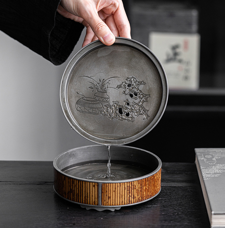 Sản phẩm không chỉ là một dụng cụ pha trà thông thường mà là một tác phẩm nghệ thuật thủ công, nơi giao thoa giữa kim khí bền bỉ và vẻ đẹp thanh cao của dòng trúc cổ xưa. Đối với những trà nhân yêu thích phong cách hoài cổ, khay trà thiếc không chỉ để sử dụng mà còn để “nuôi” và cảm nhận sự biến chuyển của thời gian trên từng thớ kim loại.