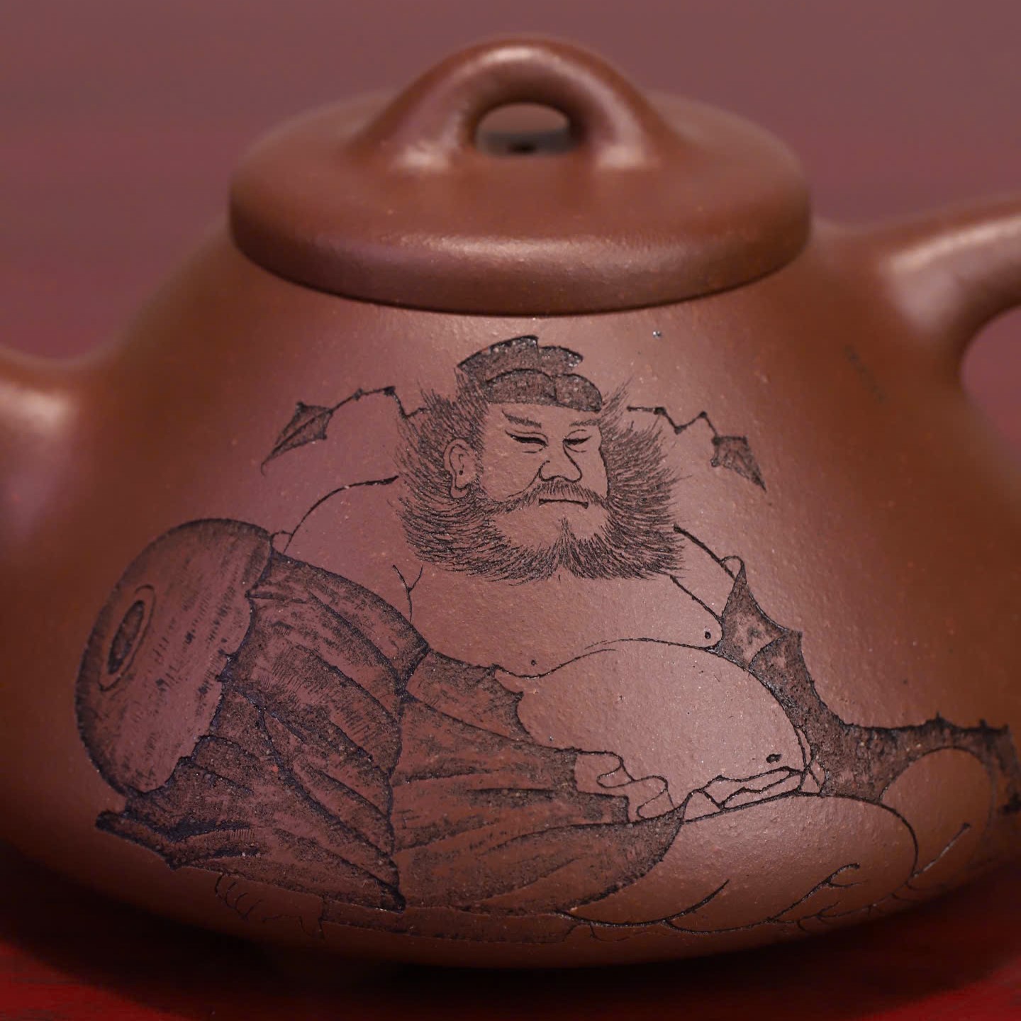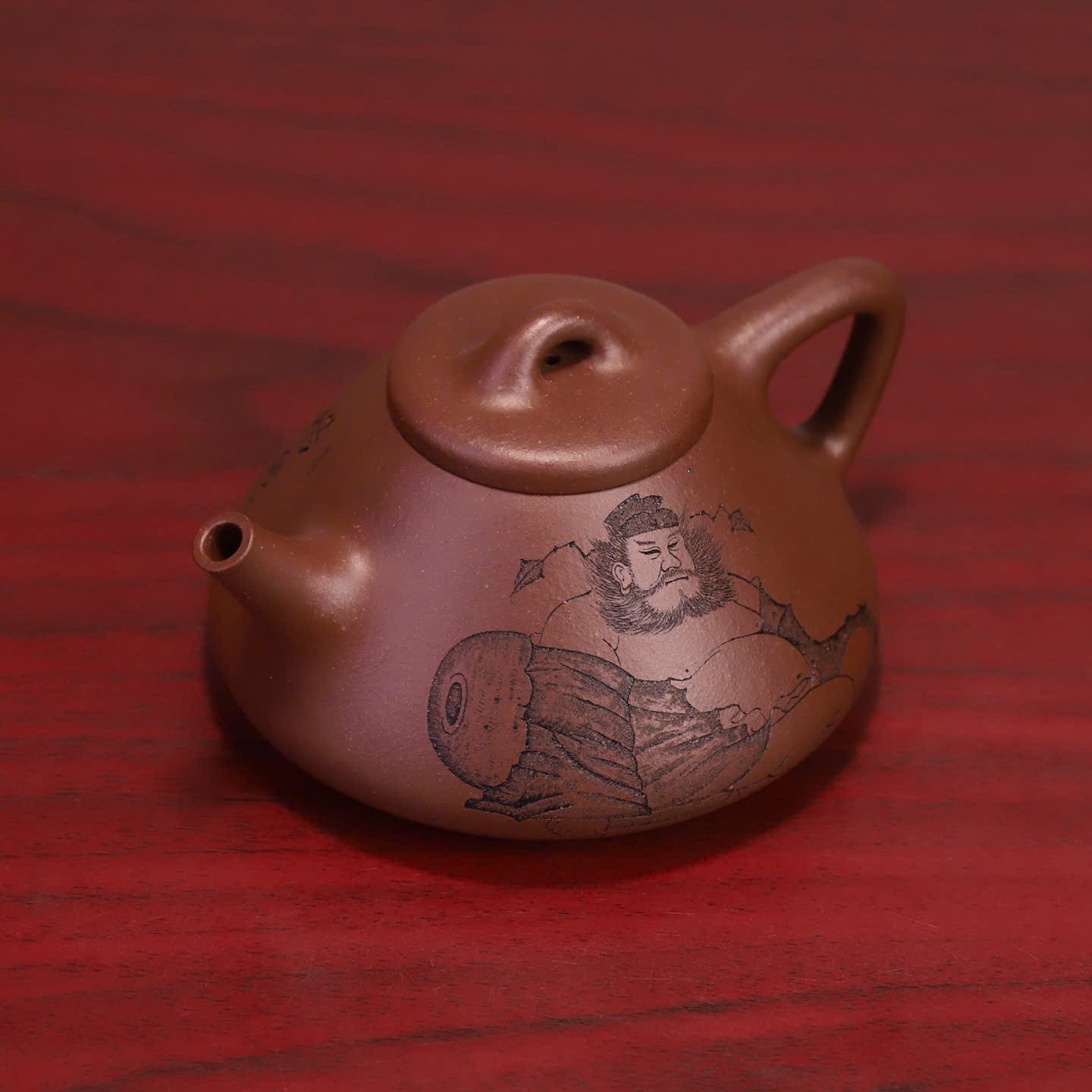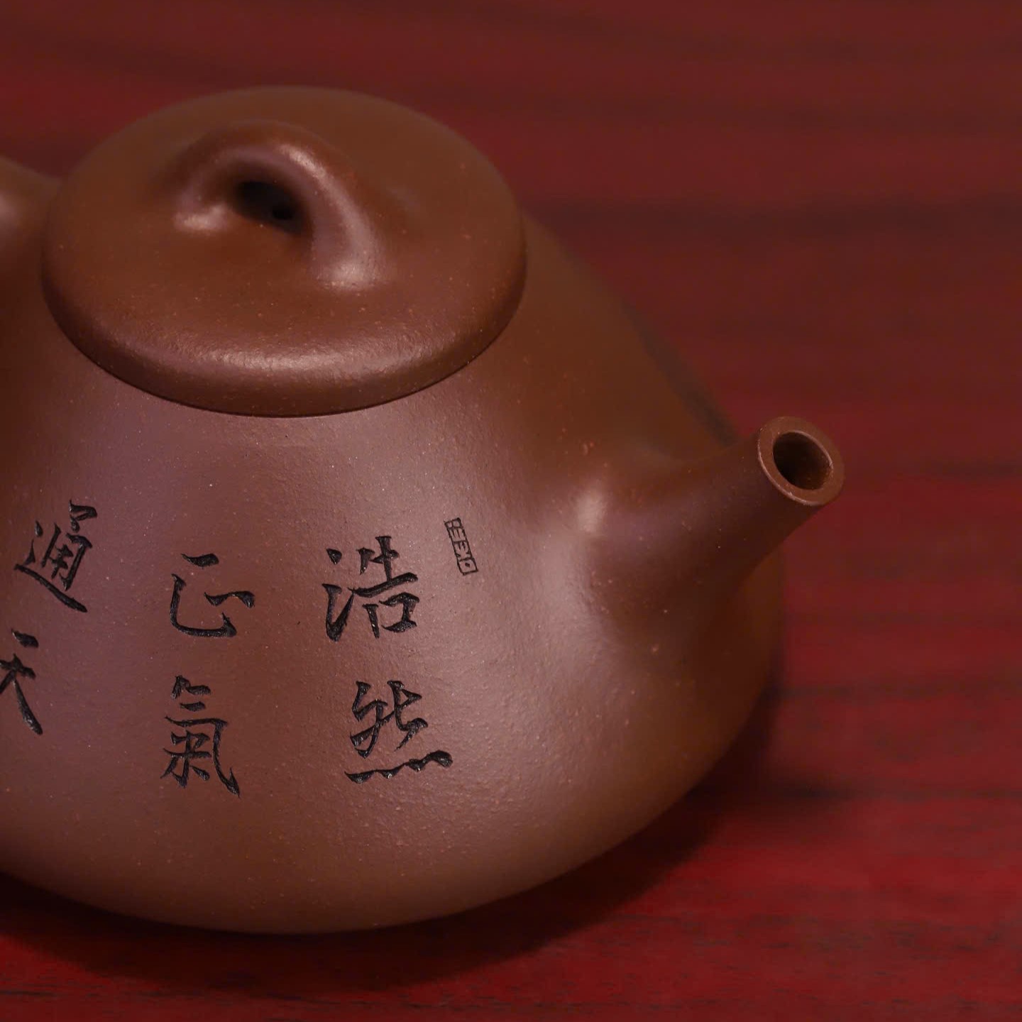 Điểm nhấn đặc biệt nhất trên thân chiếc ấm Tử Nê nguyên khoáng này là hình ảnh khắc họa nhân vật Chung Quỳ – vị thần trong văn hóa Á Đông có khả năng trừ tà, mang lại bình an. Kèm theo đó là dòng chữ thư pháp uyển chuyển: “浩然正氣 通天地” (Hạo nhiên chính khí, thông thiên địa). Dòng chữ này không chỉ tôn vinh khí tiết ngay thẳng, mạnh mẽ của người quân tử mà còn có ý nghĩa hòa hợp với năng lượng của trời đất, mang lại vận khí tốt cho gia chủ mỗi khi thưởng trà.