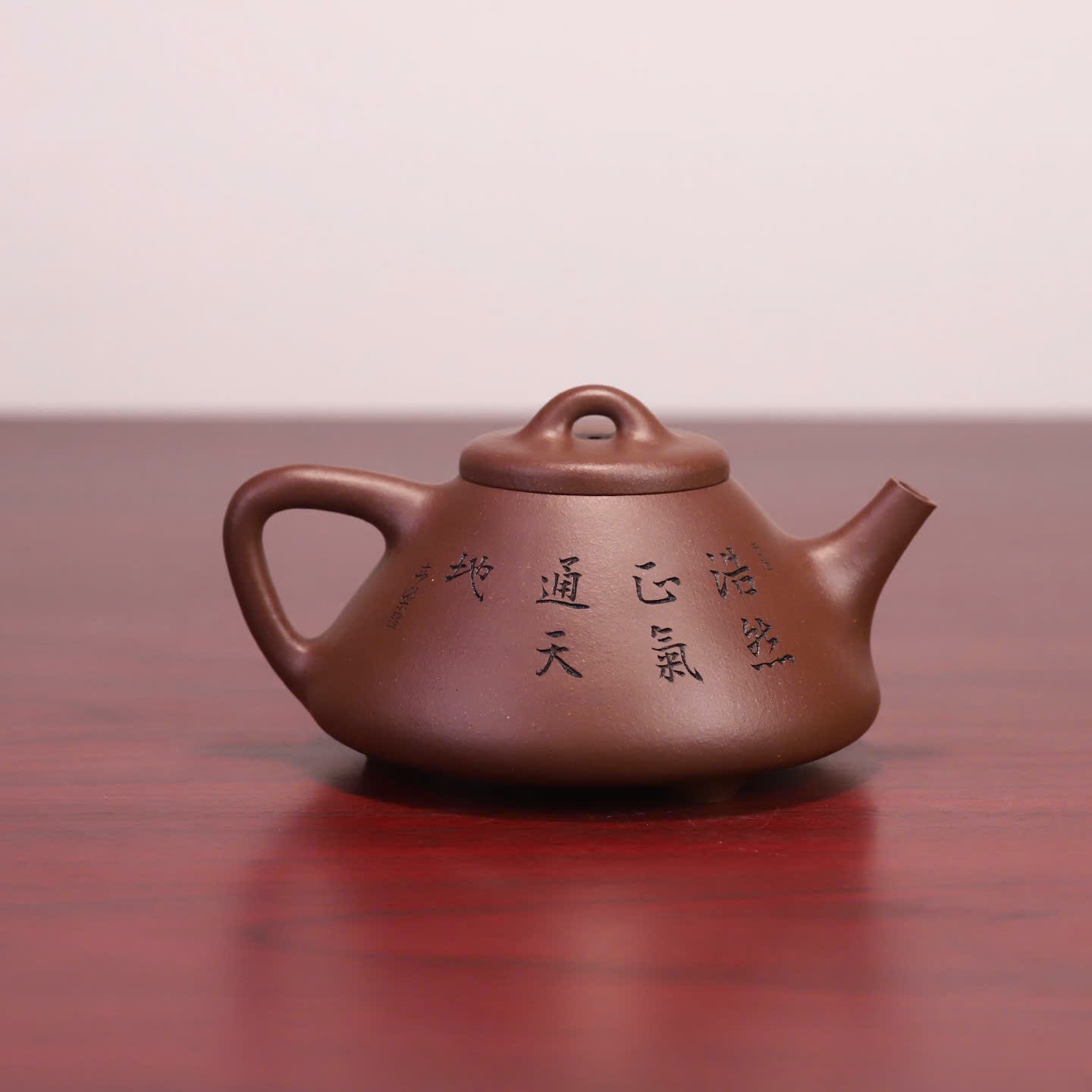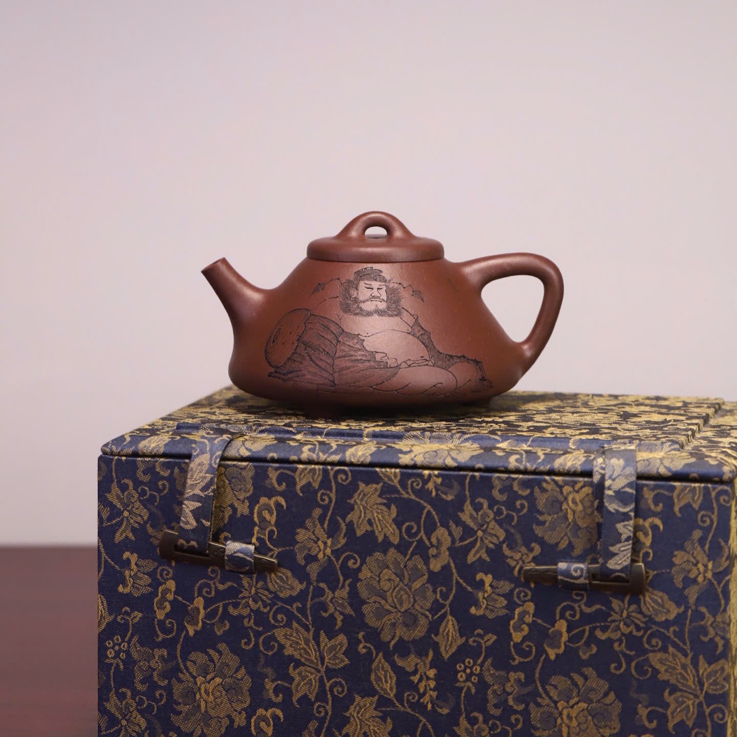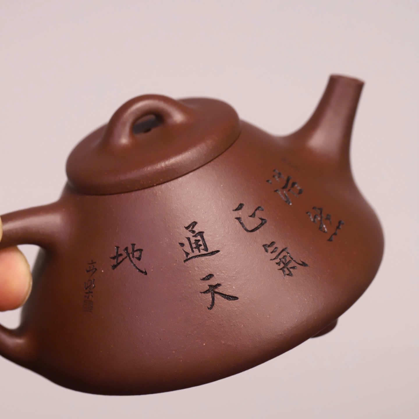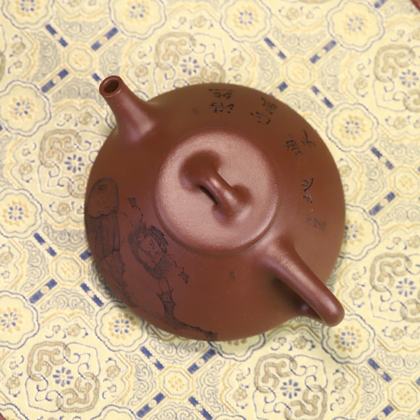 Điểm nhấn đặc biệt nhất trên thân chiếc ấm Tử Nê nguyên khoáng này là hình ảnh khắc họa nhân vật Chung Quỳ – vị thần trong văn hóa Á Đông có khả năng trừ tà, mang lại bình an. Kèm theo đó là dòng chữ thư pháp uyển chuyển: “浩然正氣 通天地” (Hạo nhiên chính khí, thông thiên địa). Dòng chữ này không chỉ tôn vinh khí tiết ngay thẳng, mạnh mẽ của người quân tử mà còn có ý nghĩa hòa hợp với năng lượng của trời đất, mang lại vận khí tốt cho gia chủ mỗi khi thưởng trà.
